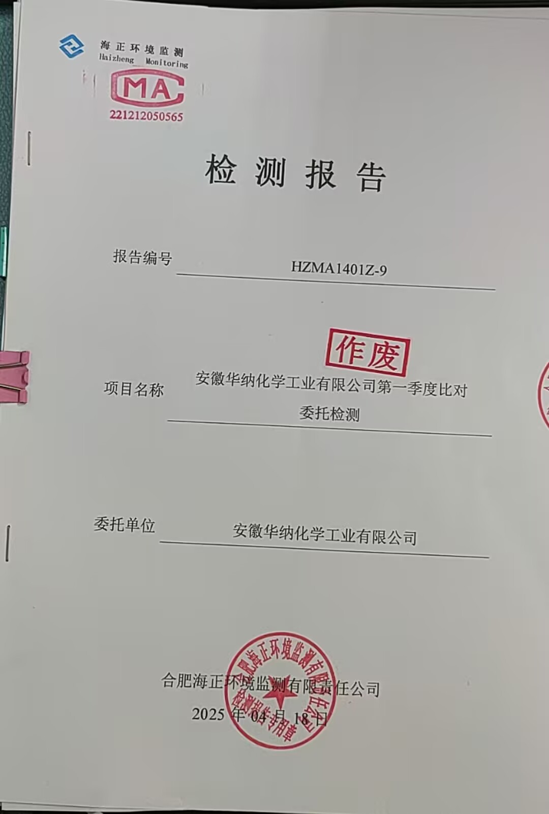 關于對委托單位:安徽華納化學工業有限公司,項目編號:HZMA1401Z-9檢測報告作廢的公示。