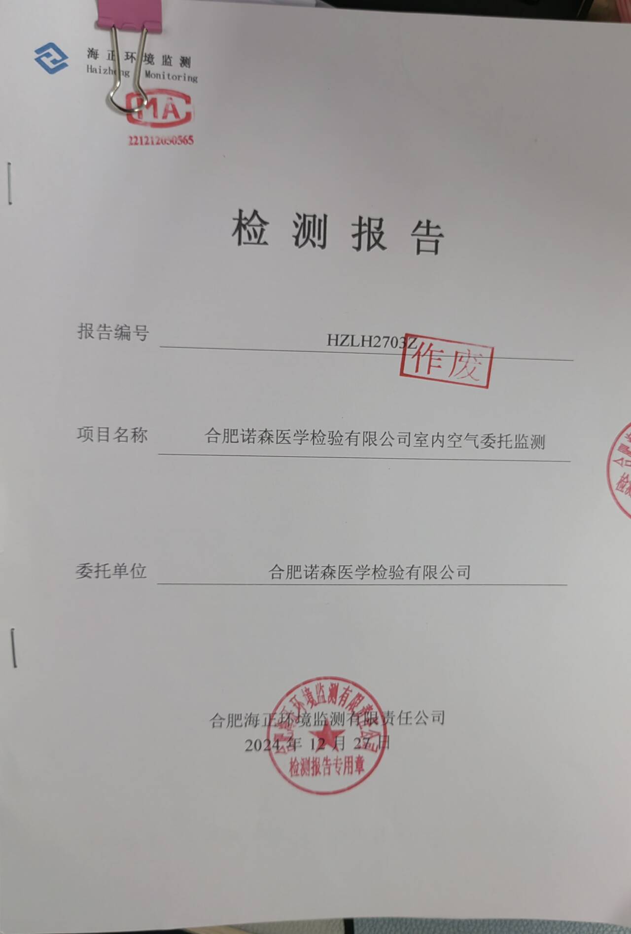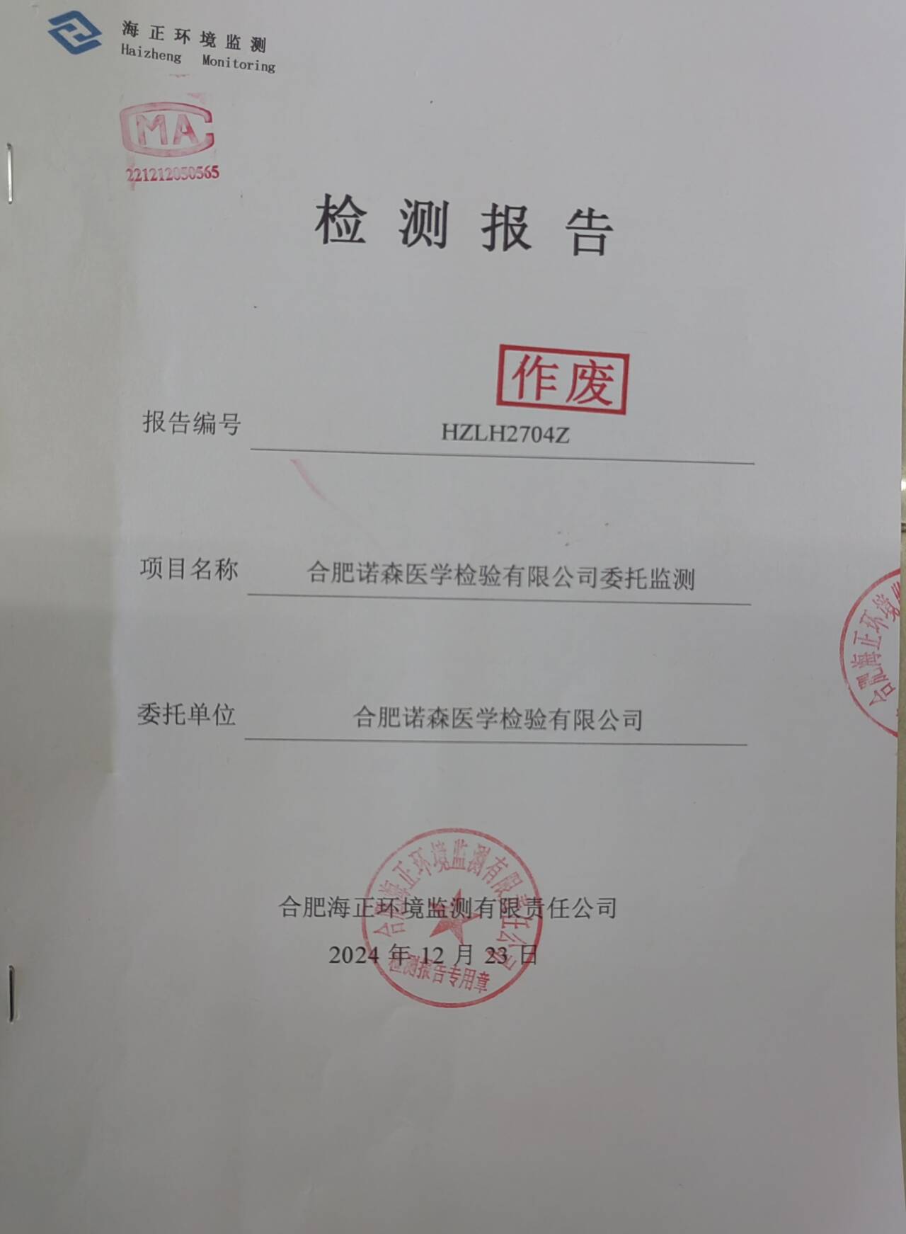 關于對委托單位:合肥諾森醫學檢驗有限公司,項目編號:HZLH2703Z和HZLH2704Z檢測報告作廢的公示。