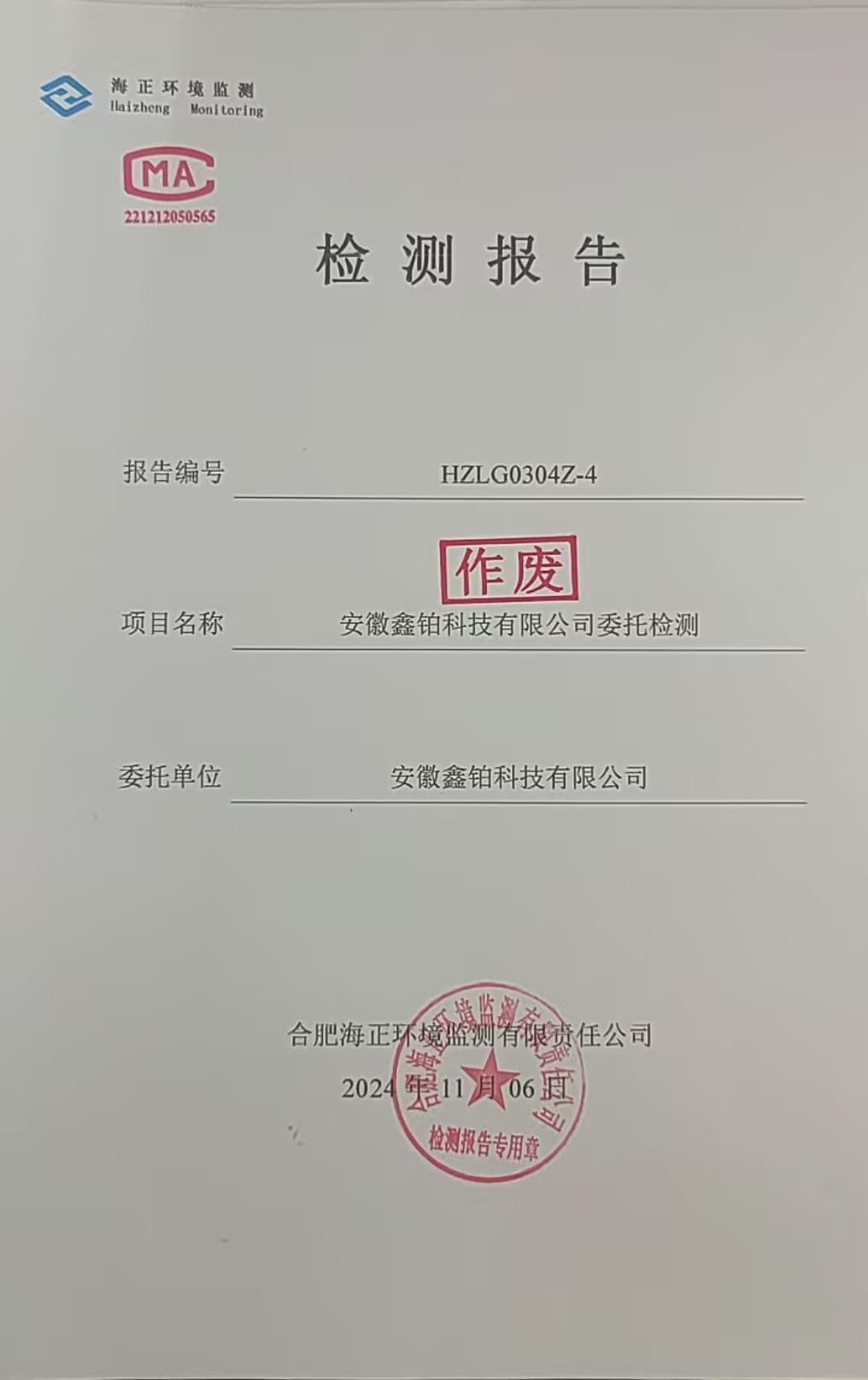 關于對委托單位:安徽鑫鉑科技有限公司,項目編號:HZLG0304Z-4檢測報告作廢的公示。
